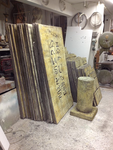 Επενδυση τοίχων με ανάγλυφο φελιζόλ για τη δημιουργία αρχαίου αιγυπτιακού τάφου.